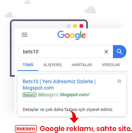Google’da yapacağınız aramalarda. Bets10’a aitmiş gibi gözüken sahte siteler karşınıza çıkabilir, yandaki örnekte gösterilen sahte sitelere giriş yapmayınız, yanında Reklam simgesi bulunan sonuçlara tıklamayınız.